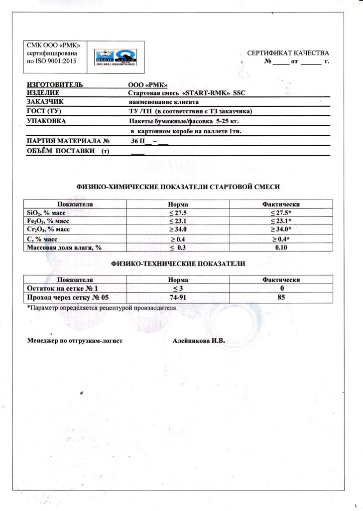 Сертификат качества на стартовую смесь – ОБРАЗЕЦ